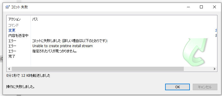 単純にコミット先のURLが存在しない場合はそのようなエラーが表示されます。コミット先のURLが存在するかを確認しましょう。「Unable to create pristine install stream」と表示される場合